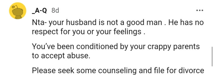 "Nta- your husband is not a good man. He has no respect for you or your feelings."