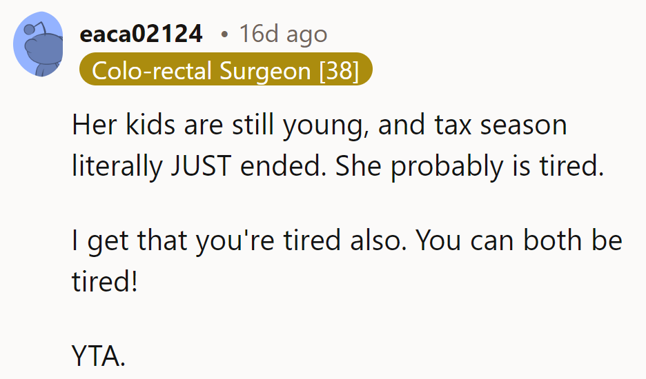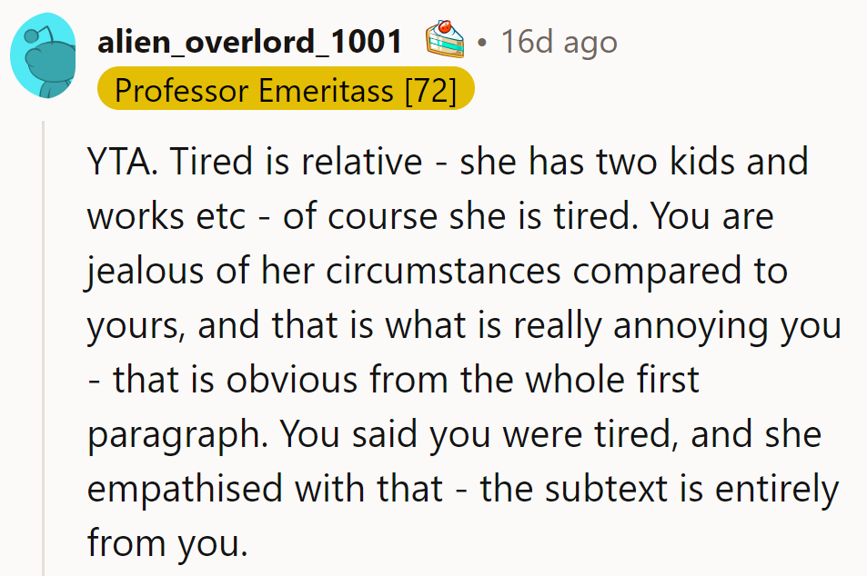 The friction arises when both sisters express feelings of tiredness. From the perspective of the less privileged sister, hearing complaints of exhaustion from someone who has so much support can feel dismissive of her own more severe struggles.