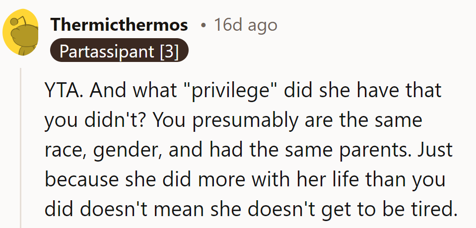 It's akin to a person in a cushioned job complaining about work stress to someone working multiple hard labor jobs to survive. The perceived insensitivity can lead to resentment and heated exchanges, as seen when one sister called the other "privileged."