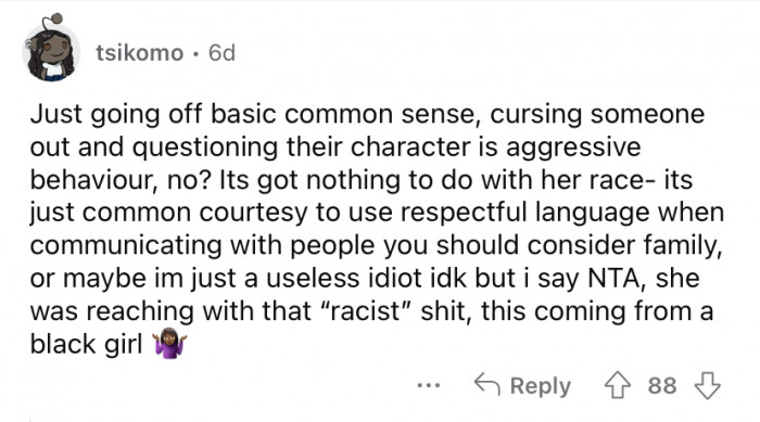 Of course, SIL shared the text exchange with her husband and he wasn't happy. He accused his sister of being racist towards his wife and invoking the "angry black woman" stereotype.
