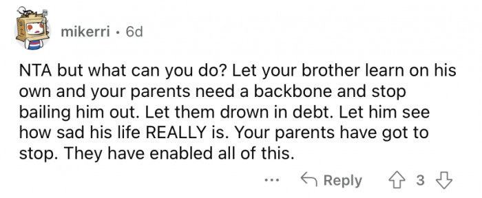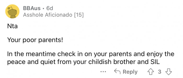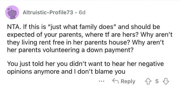 Reddit/Synergy_1986She said her brother and his wife lived with their parents for months while they were house-hunting before their parents ended up giving them a down payment for their first house.