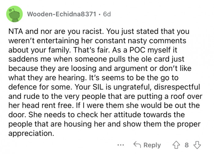 The Redditor noted that her SIL is black, which she says is important to the story. She said her brother and his wife lived with their parents for months while they were house-hunting before their parents ended up giving them a down payment for their first house.