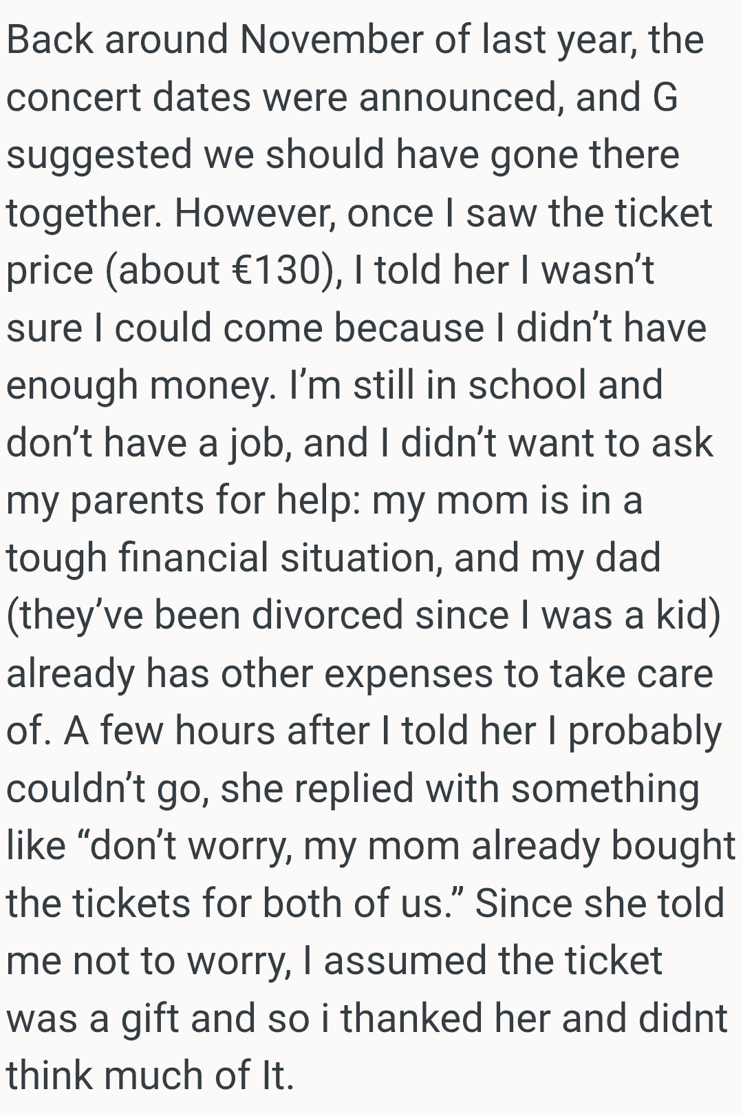 She was still in school and didn't have a job, and she didn’t want to ask her parents for help. Well, G told her that her mom bought them tickets.