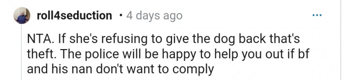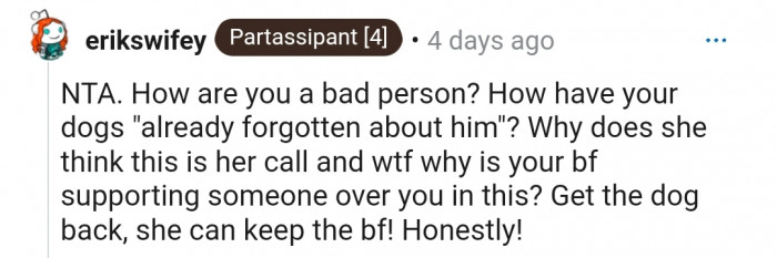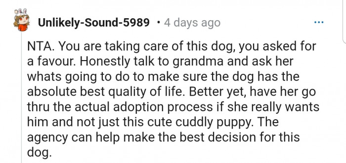 boooopy / reddit.comBoth OP's boyfriend and his nan are making her feel guilty. But she's adamant about taking the dog home regardless.