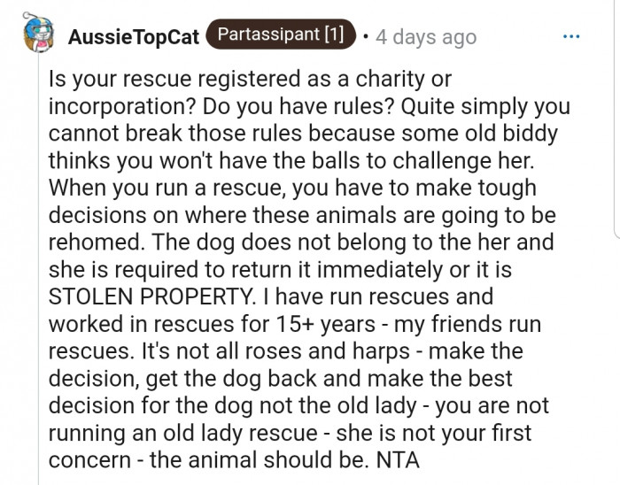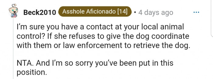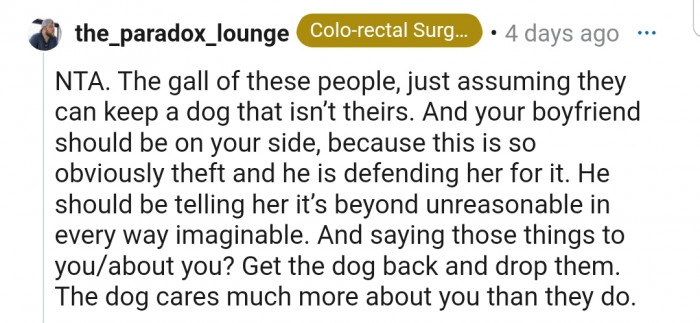 "NTA. The gall of these people, just assuming they can keep a dog that isn’t theirs."