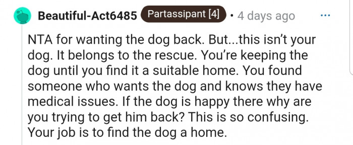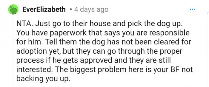 Indeed, OP genuinely doesn't want to cause any drama with her boyfriend or his family, but she doesn't think it's right for them to demand to keep the dog without going through the normal adoption process. We hope this issue can be resolved soon so everyone involved can be happy again.