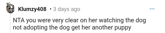 "NTA. You were very clear about her watching the dog, not adopting the dog."