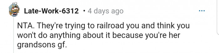 "They're trying to railroad you and think you won't do anything about it because you're her grandson's girlfriend."