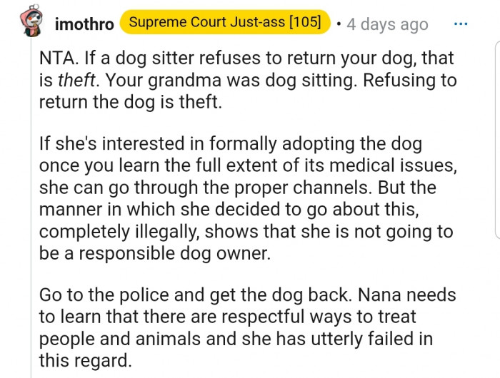 "If a dog sitter refuses to return your dog, that is theft. Your grandma was dog-sitting. Refusing to return the dog is theft."