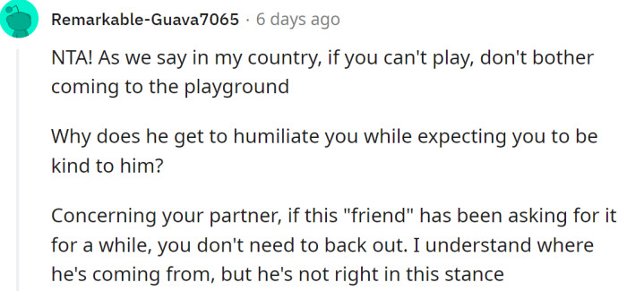 Making fun of or mocking a friend can break the trust and bond that has been established and may lead to lasting emotional scars. Thus, according to Redditors, the OP was not wrong for responding to her friend John in the same manner.
