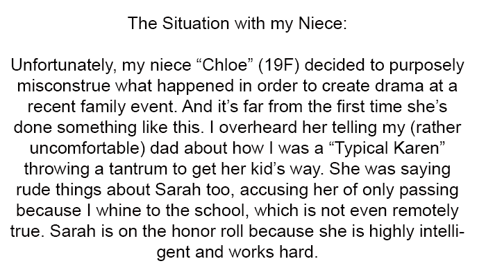 Amid accusations of being a "Karen" and unfair assessments of her daughter's academic integrity, this woman faced a dilemma at a recent family function. Frustrated by her niece's deliberate misrepresentation of events and disparaging remarks about her daughter, she chose to confront the drama head-on, leading to a heated exchange that left her questioning her actions.