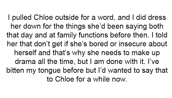 NTA. Chloe is part of the reason why “Karen” is a useless term—it’s been weaponized against any woman who speaks up, even when she’s righteous.
