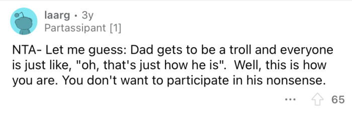 What's your take on this situation? Do you think the OP is wrong for how he's been dealing with his father, or is he just trying to do the right thing by keeping the peace?