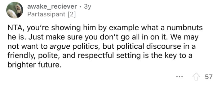 Recently, Reddit user u/doubled-or-nothing shared a story in the AITA (Am I The A**hole?) subreddit about his experience. The OP explained that his dad loves to engage in political discussions, which can often become heated.