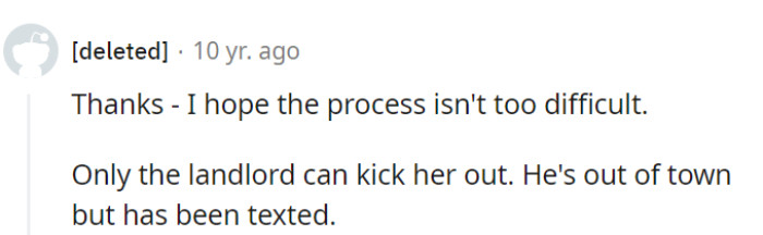 "Only the landlord can kick her out."