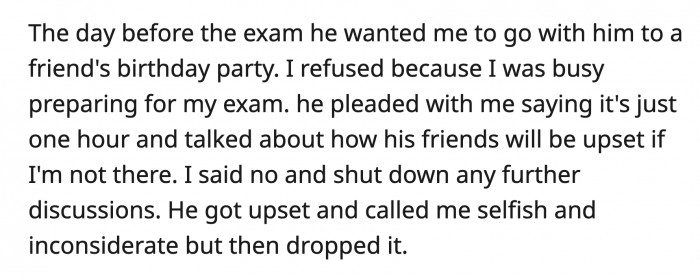 It is her last year of study, and she needed to focus because it was the most challenging year yet. On the day before OP's final exam, her husband wanted her to accompany him to a friend's birthday party.