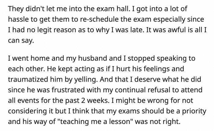 He believes OP deserves what happened to her because she turned down all his invitations to parties over the past two weeks. OP acknowledges she may be wrong to think that her exams should be prioritized, and she believes her husband's way of "teaching her a lesson" was wrong.