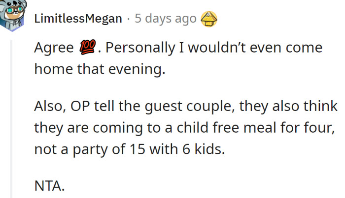 Later that day, he further informed her of his decision to invite two colleagues, their wives, and children, adding two more kids to the guest list. This increased the total from four to fifteen guests.