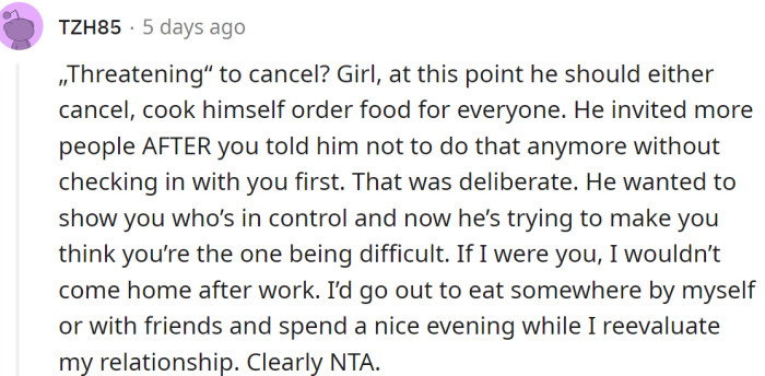 Redditor's Boyfriend Invites Fifteen People To Dinner Instead Of The Agreed Two And Threatens To Cancel Everything If She Doesn't Cook