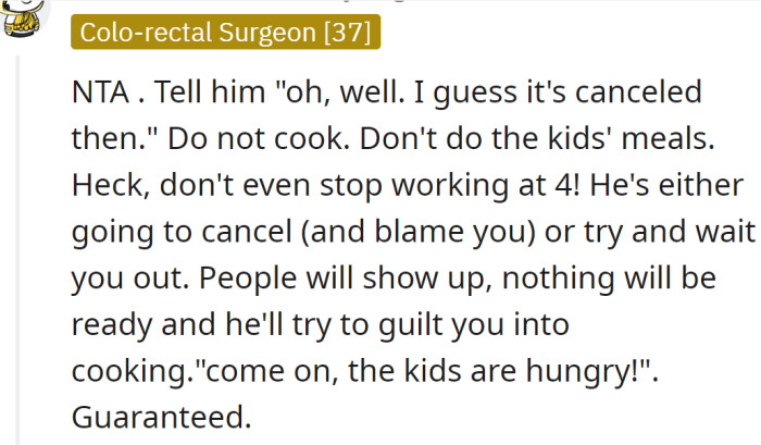 Adding to her frustration, he suggested she prepare a separate dish for his colleagues' kids. Upset over the increased guest count and the assumption that she'd adjust her cooking plans, she suggested her boyfriend should cook, especially since he had more free time that afternoon.