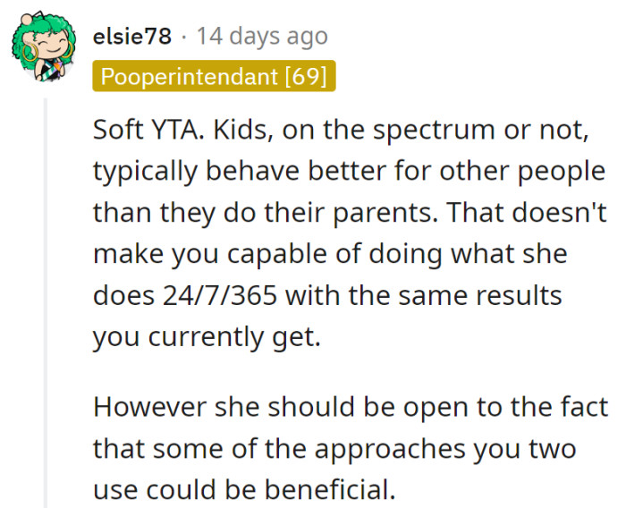 This suggests that the woman’s approach to parenting, although criticized by her family, may actually benefit her nephew in the long run.