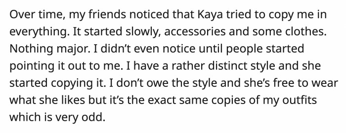 OP's friends noticed that Kaya was copying her, and she was not secretive about it. OP didn't notice until her friends pointed out that Kaya would wear the same accessories and the same clothes as her.