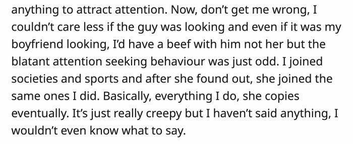 In this situation, OP could benefit from directly communicating her discomfort with Kaya's behavior, reinforcing her own identity in the process. Research suggests that assertive communication can significantly reduce anxiety and improve relational dynamics, allowing both parties to express their needs without resorting to passive-aggressive behaviors or imitation.