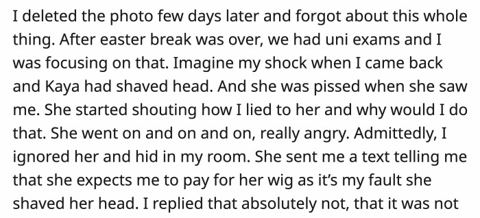 Kaya didn't let up and began texting OP. She wanted OP to pay for her wig because, according to Kaya, it was OP's fault she shaved her head.