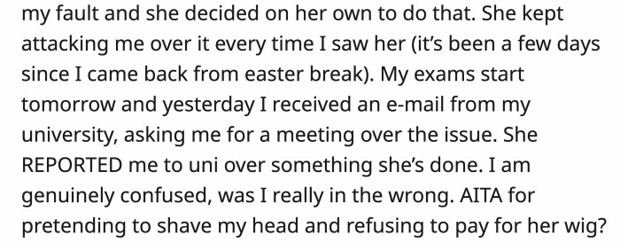 OP said she would do no such thing because Kaya decided to shave her hair all by herself. OP thought that was the end of it, but Kaya began harassing her every time they crossed paths.
