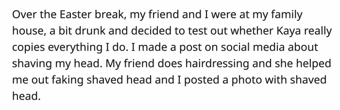 Home for Easter break, OP and her friend were a little inebriated, and they decided to launch the ultimate test to see if Kaya really does imitate OP. She posted on her social media, hinting about shaving her head.