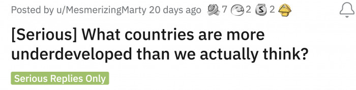 In a r/AskReddit post, a Redditor asked people which countries they believe are more underdeveloped than meets the eye. It was a serious topic that the OP wanted to delve into, with the moderator setting up rules for participants to take it seriously.