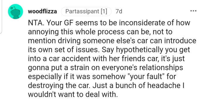 In the end, the Reddit community's verdict is clear: OP is not to blame in this situation. Their concerns about wanting quality time and unease over driving a stranger's car were valid.