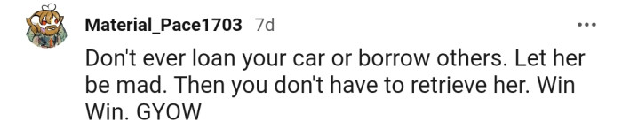"Don't ever loan your car or borrow others"