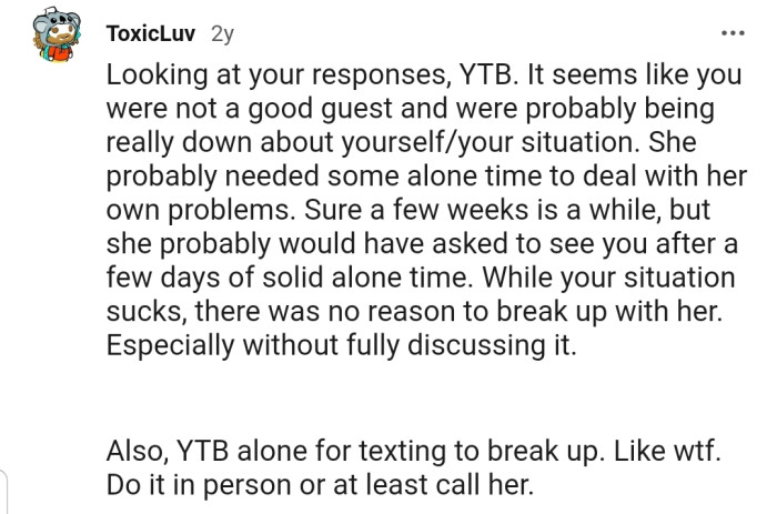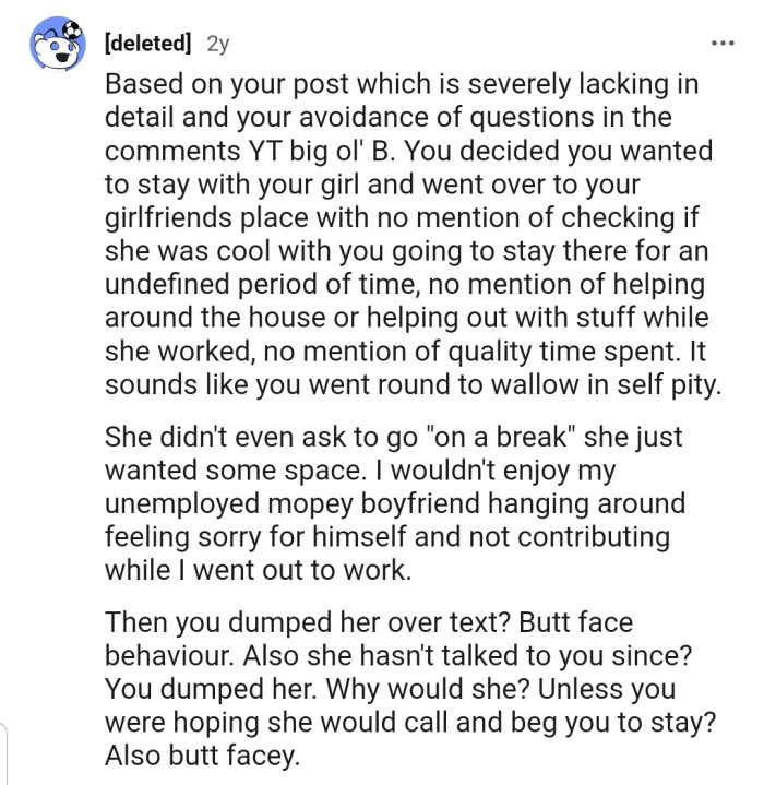 Reddit.comOP lost his job during lockdown. And when the lockdown was relaxed, he decided to stay at his girlfriend's place for a while to clear his head. A few nights in, she told him that she needed a break and sent him back home.