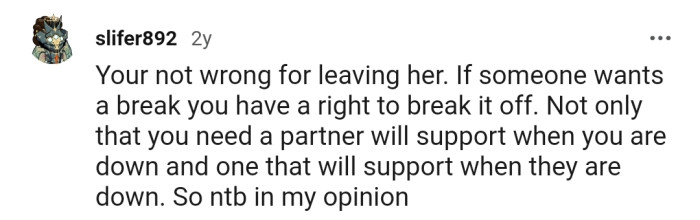 "You're not wrong for leaving her. If someone wants a break, you have a right to break it off."