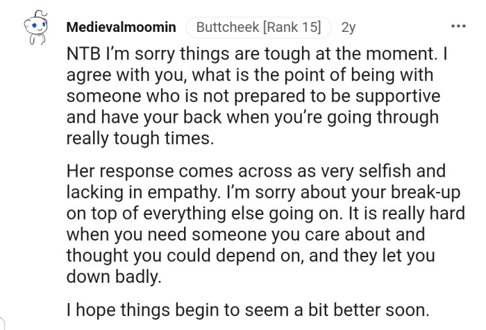 "While your situation sucks, there was no reason to break up with her, especially without fully discussing it."
