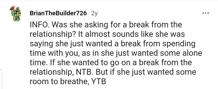 "If she wanted to go on a break from the relationship, NTB. But if she just wanted some room to breathe, YTB."