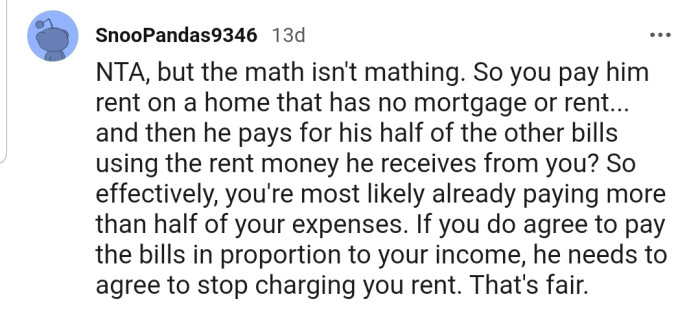 "I would agree to split actual bills based on your relative income levels ONLY IF he stops charging you rent."
