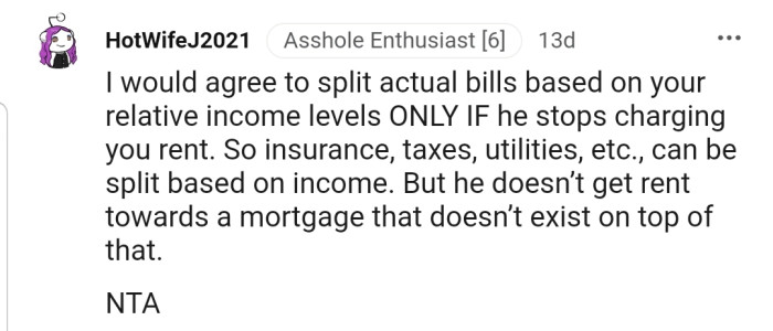 Reddit.comNow, after hitting the jackpot with her new job, he wants them to split expenses proportionally to income. However, OP doesn't think this is fair.