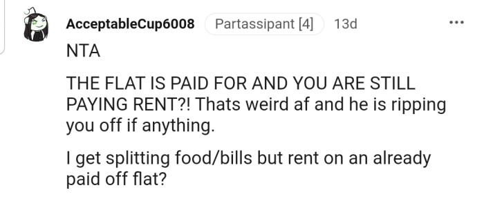 "I get splitting food/bills, but rent on an already paid-off flat?"