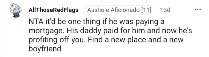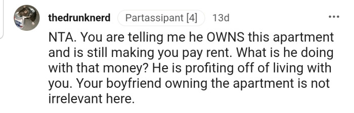 The popular opinion is that OP is NTA. Their supporters backed this up by stating that they are already doing a lot by paying rent to their significant other.