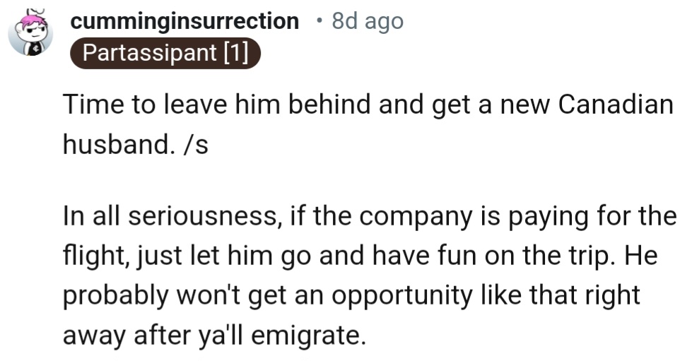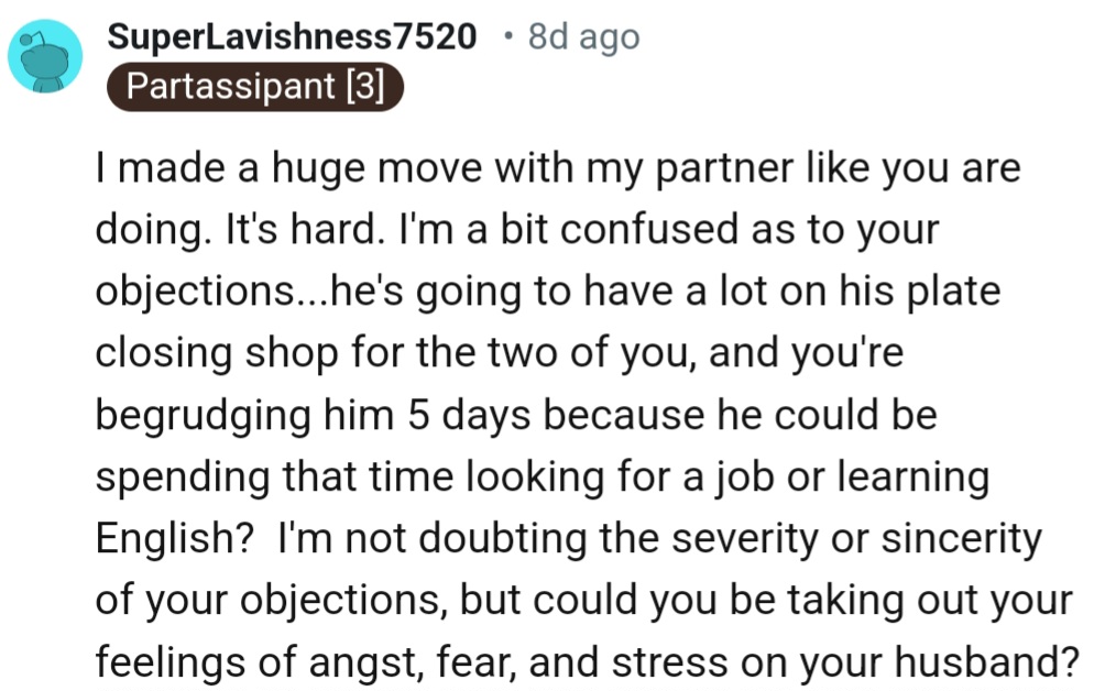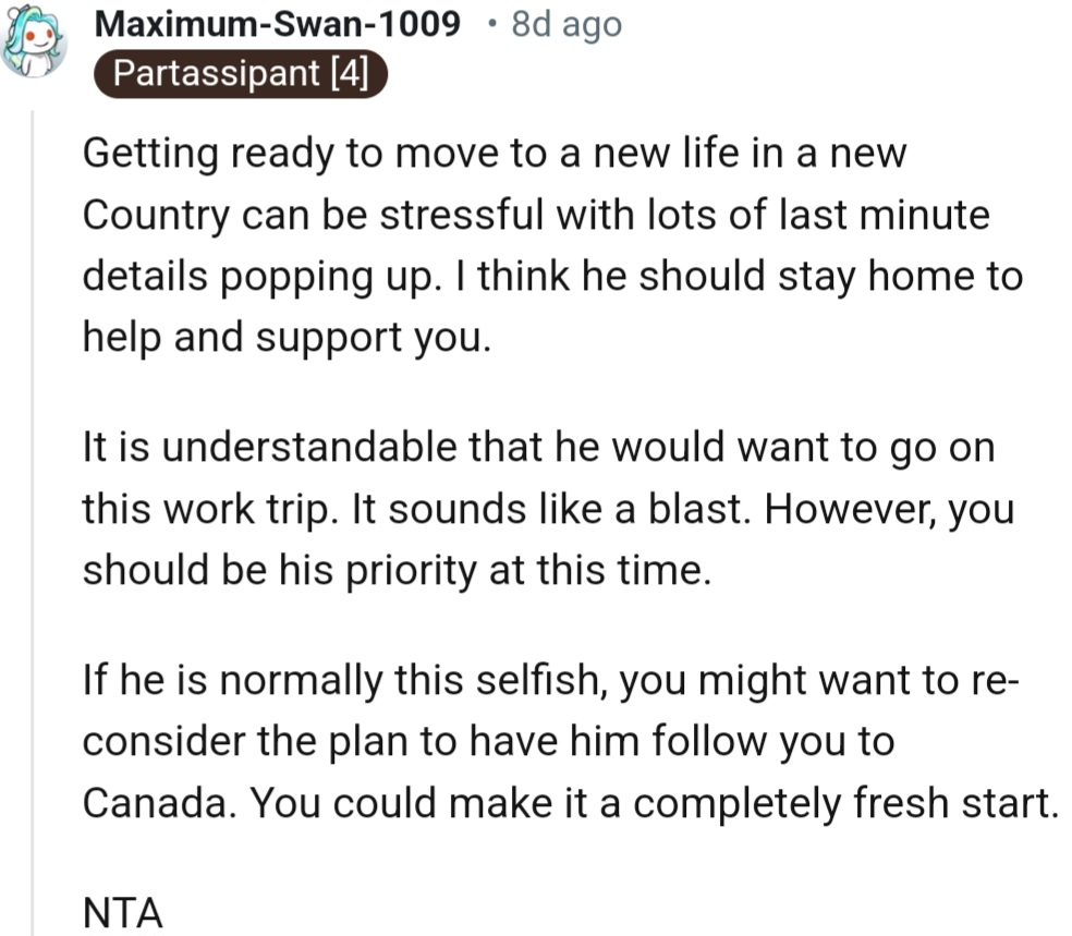 From OP’s perspective, this trip was a colossal misalignment with their current priorities. With so much at stake—working hard for promotions, starting a master’s program for extra immigration points, and prepping for English exams—this detour felt like a slap in the face.