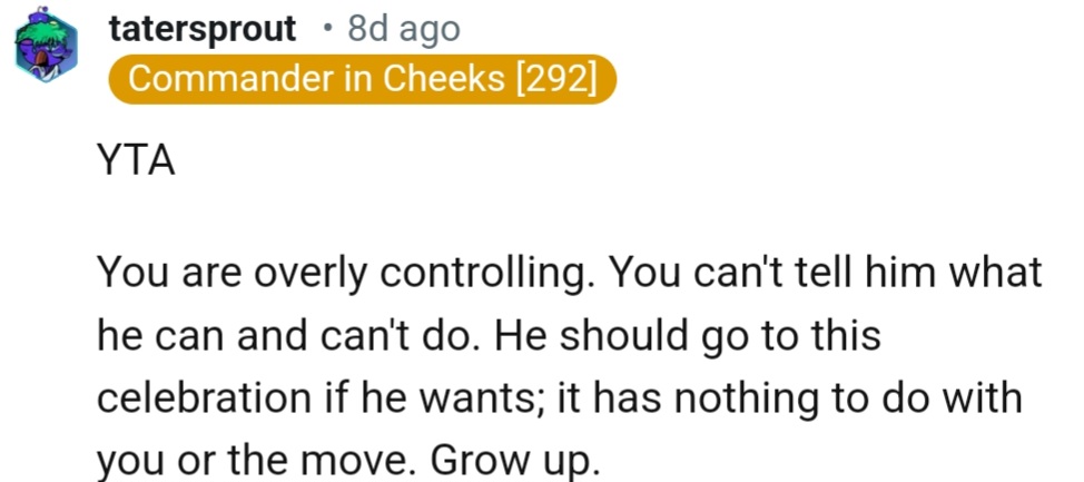 "He should go to this celebration if he wants; it has nothing to do with you or the move"