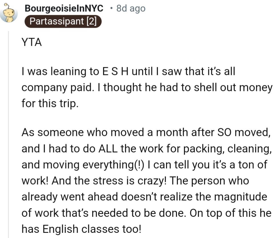 Redditors wasted no time in slamming OP with the AH title. With them leaving a month early and their fiancé shouldering most of the moving burden, they believed he deserved a few days of fun before the chaos.