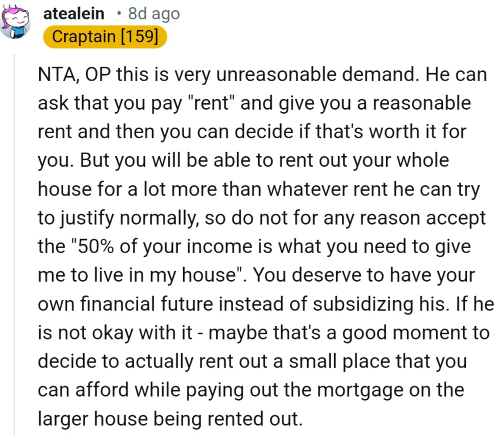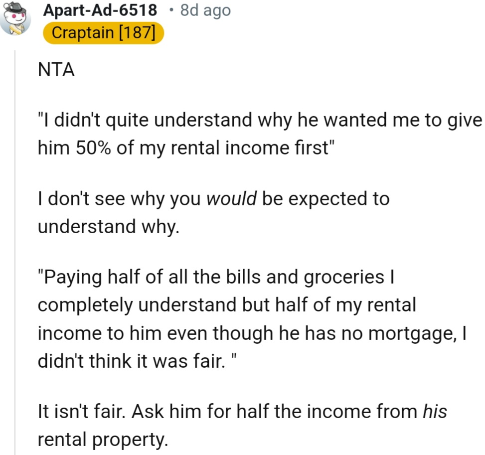 He suggested she not only pay half of all bills and groceries—which she found reasonable—but also fork over 50% of her rental income.