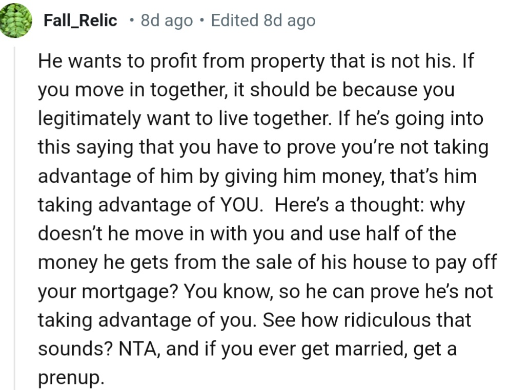 Not to mention his audacious claim on half her rental income while keeping 100% of his own. The community urged OP to reconsider this lopsided deal before taking the plunge into cohabitation.