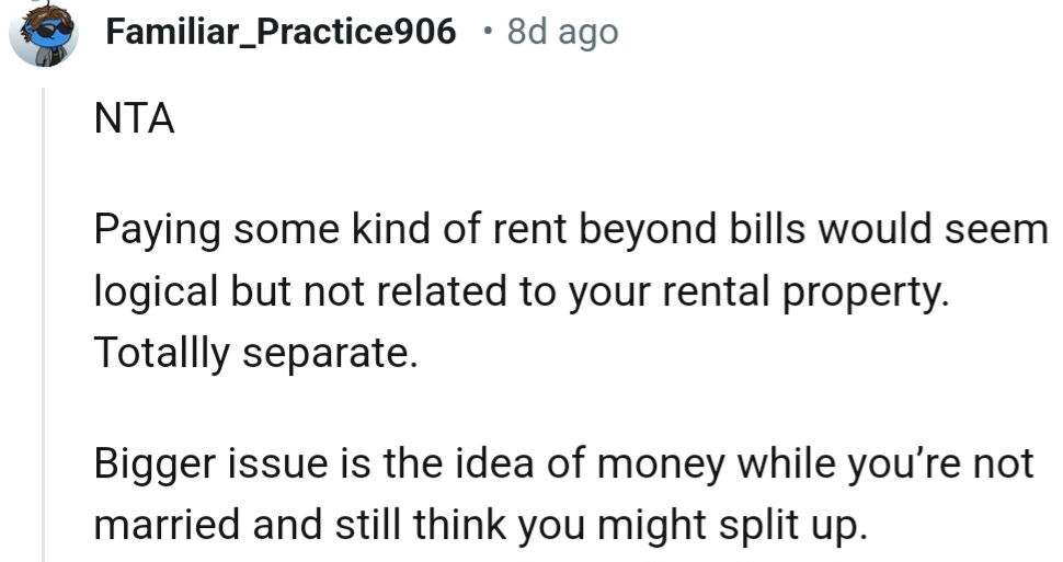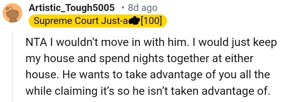 His reasoning? If they ever parted ways, he didn't want to feel like she had taken advantage of the living arrangement. However, OP saw things differently.