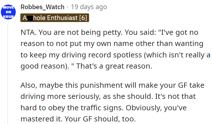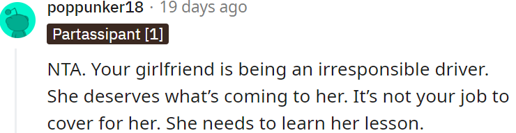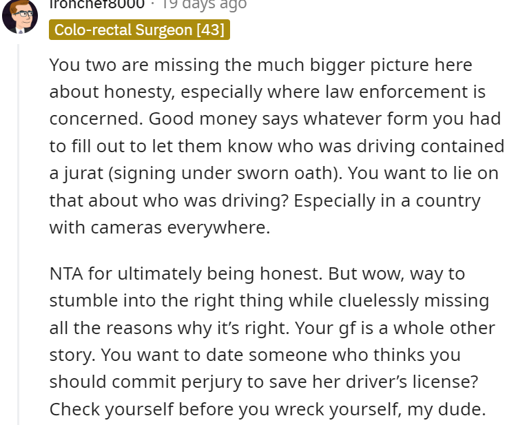 By refusing to cover for his girlfriend, OP was sending a crucial message about accountability on the road. Apart from the obvious crime of lying to law enforcement, enabling her reckless behavior was akin to green-lighting future speeding escapades.
