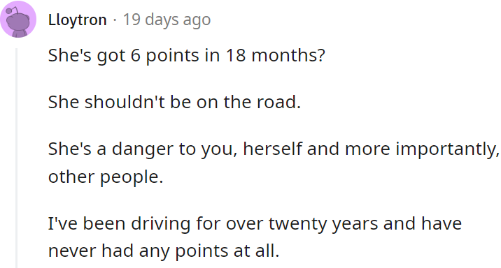 "She's got 6 points in 18 months? She shouldn't be on the road."