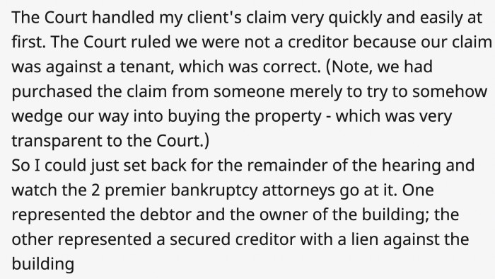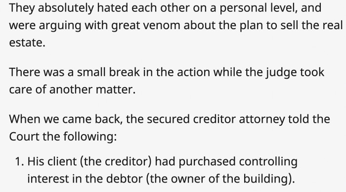 24. The debtor owes the creditor about 50 million, and instead of paying expensive lawyer fees, he buys the building instead for a smaller amount and assumes the debt he was owed in the first place